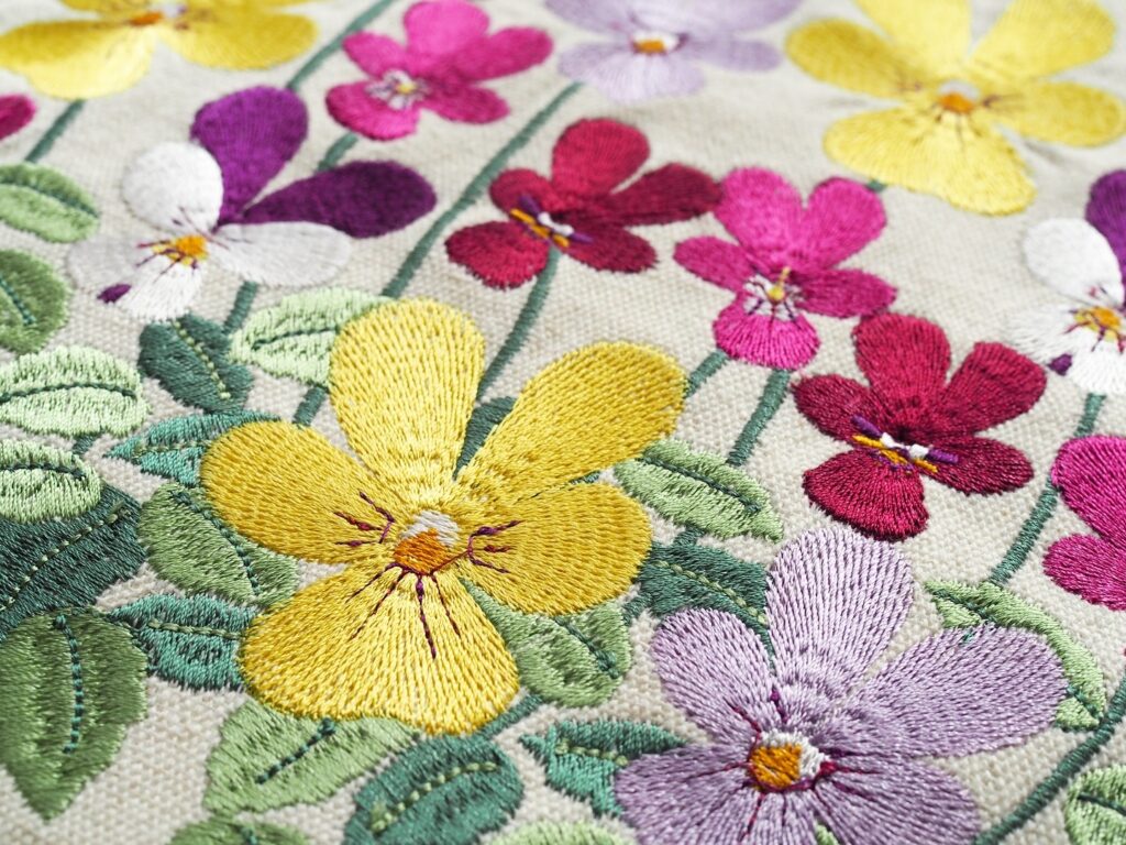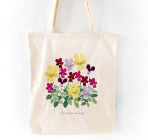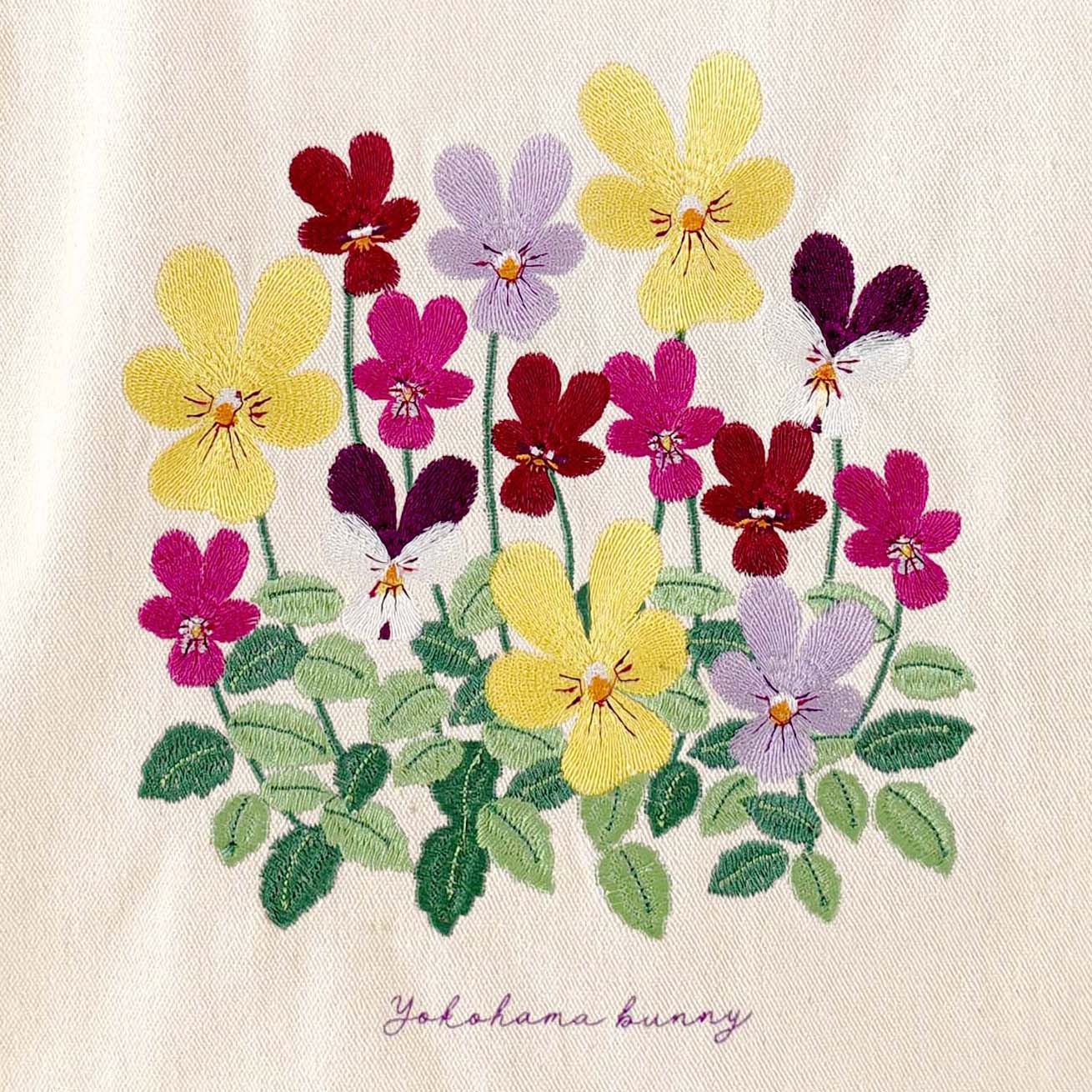描き下ろしたビオラのイラストを刺繍で表現したオリジナルトートバッグ。